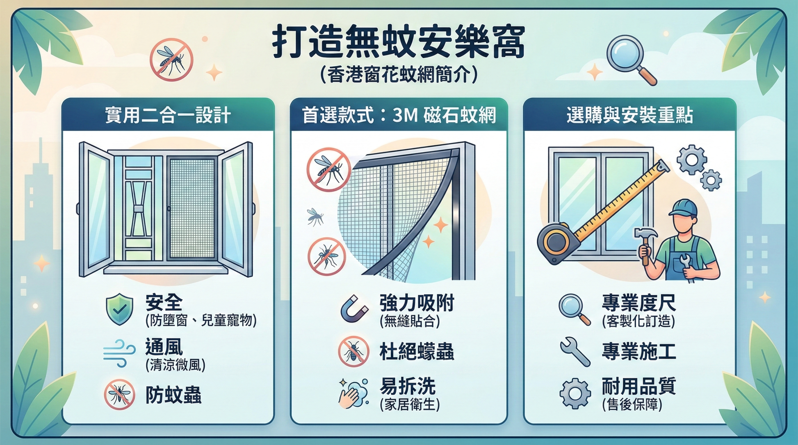 香港春夏交替,天氣潮濕悶熱,正是蚊蟲瘋狂肆虐的季節。想打開窗戶享受清涼微風,卻又擔心惹蚊入屋?這時候,為家居安裝實用且美觀的窗花蚊網,便成為了提升居住生活品質的關鍵。面對市面上五花八門的防蚊產品,究竟該如何挑選才能達到最佳效果?本文將為您全面拆解防蚊網的選購秘訣、預算考量與實用建議。
