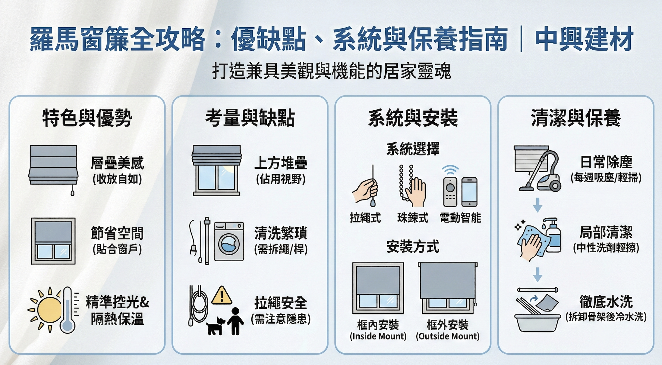 許多客戶在諮詢時會問:「羅馬簾有什麼缺點?」我們整理了以下幾點供您考量: